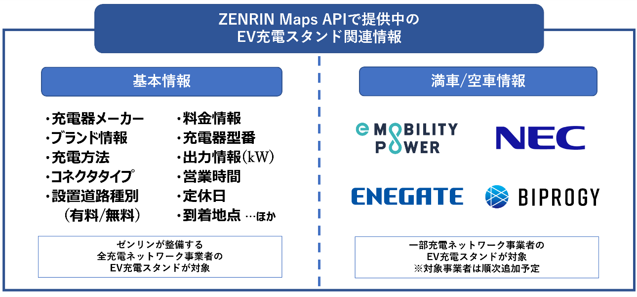 株式会社ゼンリン(本社:福岡県北九州市、代表取締役社長:竹川道郎、以下ゼンリン)は、地図API「ZENRIN Maps API」にて提供中の、満車・空車状況をリアルタイムで確認できる「EV充電スタンド満空情報配信機能」に、新たに株式会社e-Mobility Powerの約25,600口(※1)の情報を追加しました。これにより本APIは、現在提供中の株式会社エネゲート、日本電気株式会社、BIPROGY株式会社の情報と合わせて、約28,000口(※2)の満空情報配信が可能な、国内最大規模のサービスとなります。