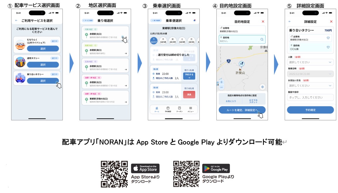 本実証事業では同年7月28日より、アルパインマーケティングとゼンリンが共同開発した配車アプリ・システム「NORAN(ノラン)」を導入し、公共ライドシェアのオンデマンド配車予約・配車指示に対応してきました。このたび2月6日(金)から2月27日(金)までの期間、本アプリにて新たに乗り合いタクシーおよび通常タクシーの配車機能の提供を開始します。宗像市では公共ライドシェアに加え、乗り合いタクシー、通常タクシーの配車が1つのアプリで完結。利用者のライフスタイルや移動のニーズに合わせた交通手段の選択を支援します。