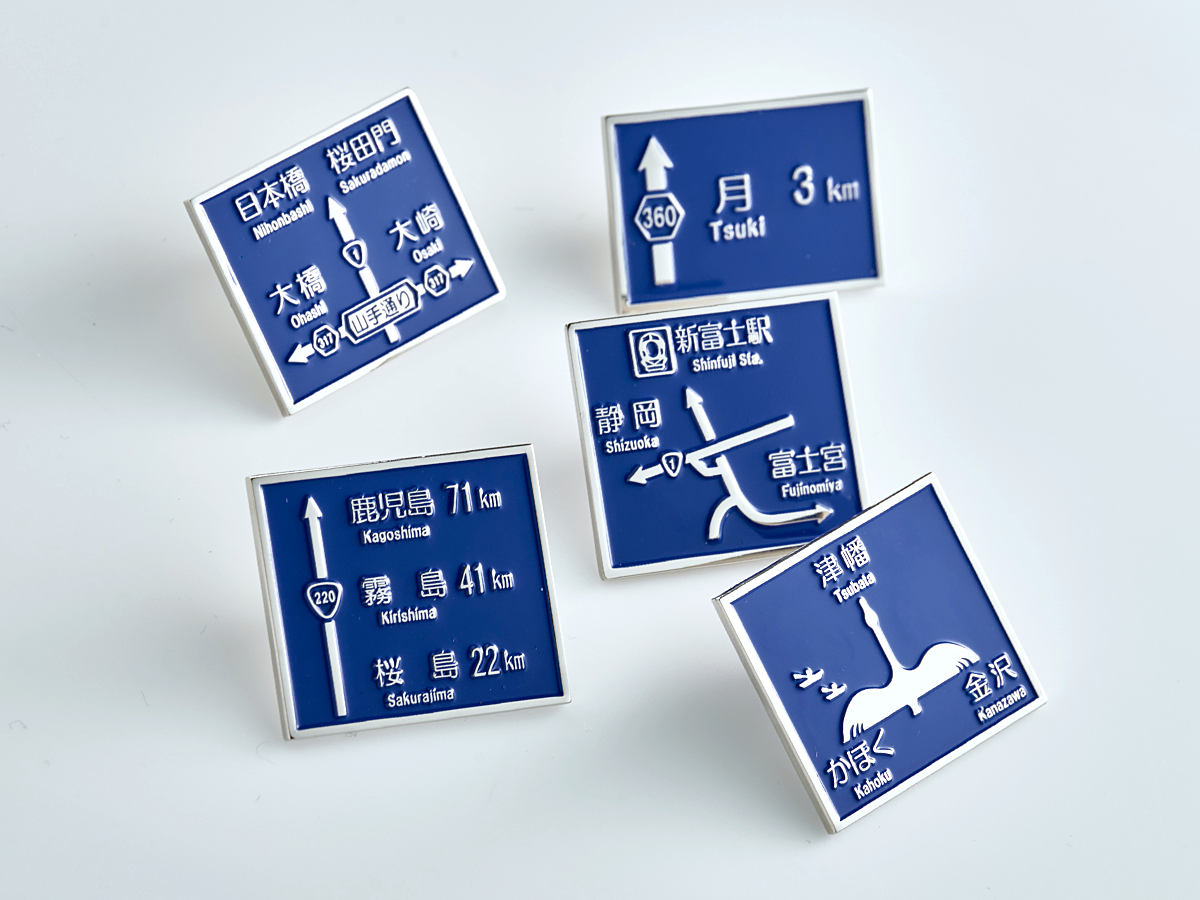 実在する方面看板を再現したピンバッジです。ゼンリン公式Xアカウントに寄せられたユーザーの声をもとに、形状や地名がユニークで特徴的な方面看板を選定しました。