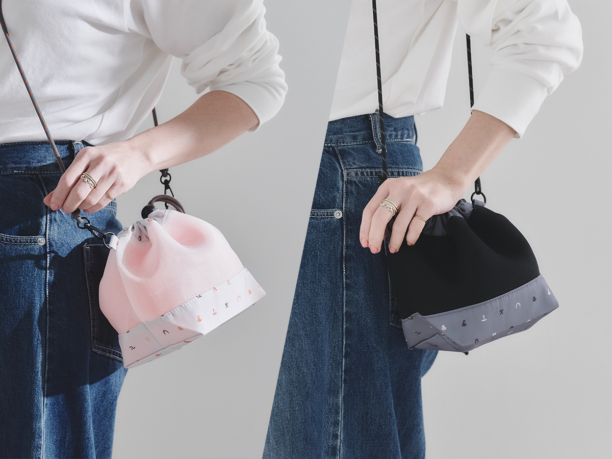 財布やスマートフォンなど、手回り品をまとめて持ち歩ける巾着型のミニショルダーバッグです。立体感のある軽量なメッシュ素材を使用し、身軽に動きたいシーンに最適です。