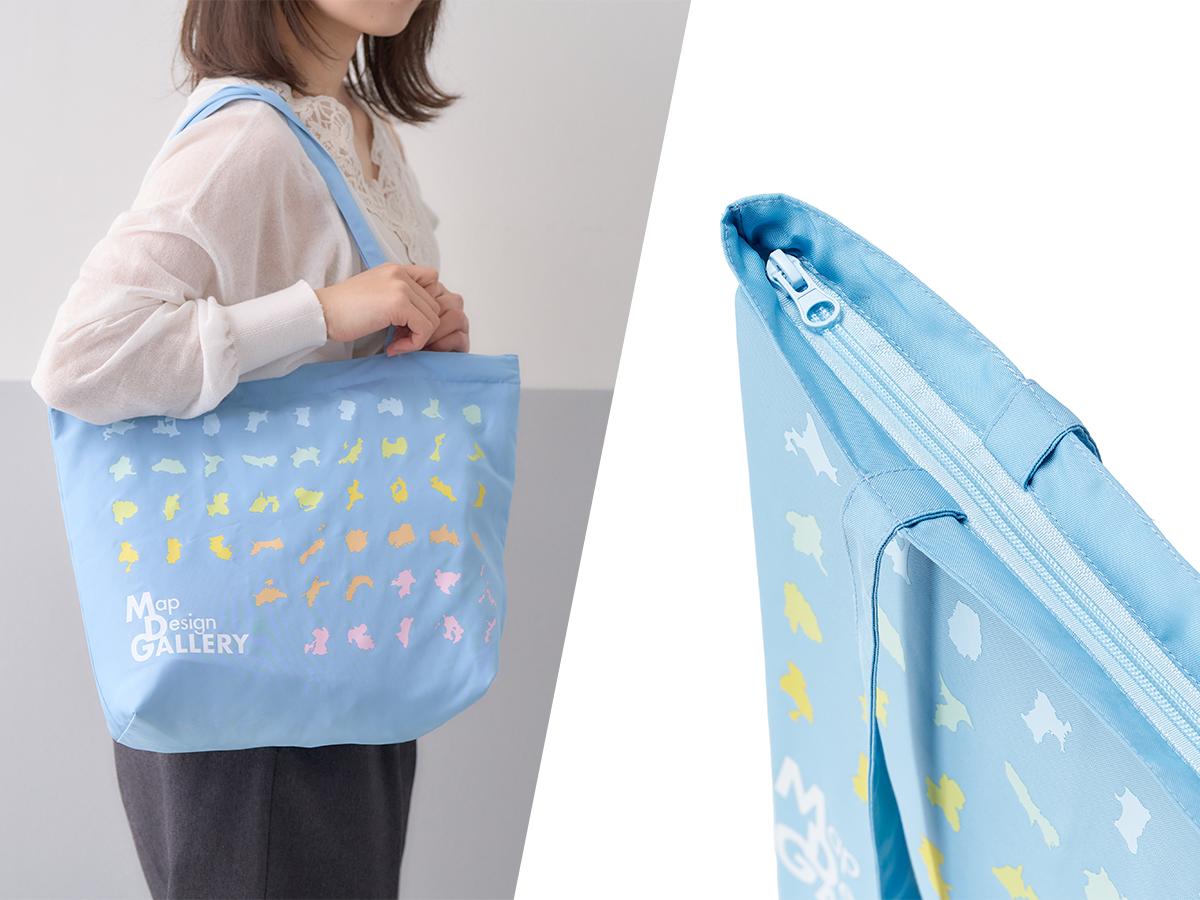 春らしい爽やかなブルーの生地に、47都道府県のシルエットをカラフルにプリントしたトートバッグ。ファスナー付きでA4サイズもしっかり入る実用的なサイズ感です。