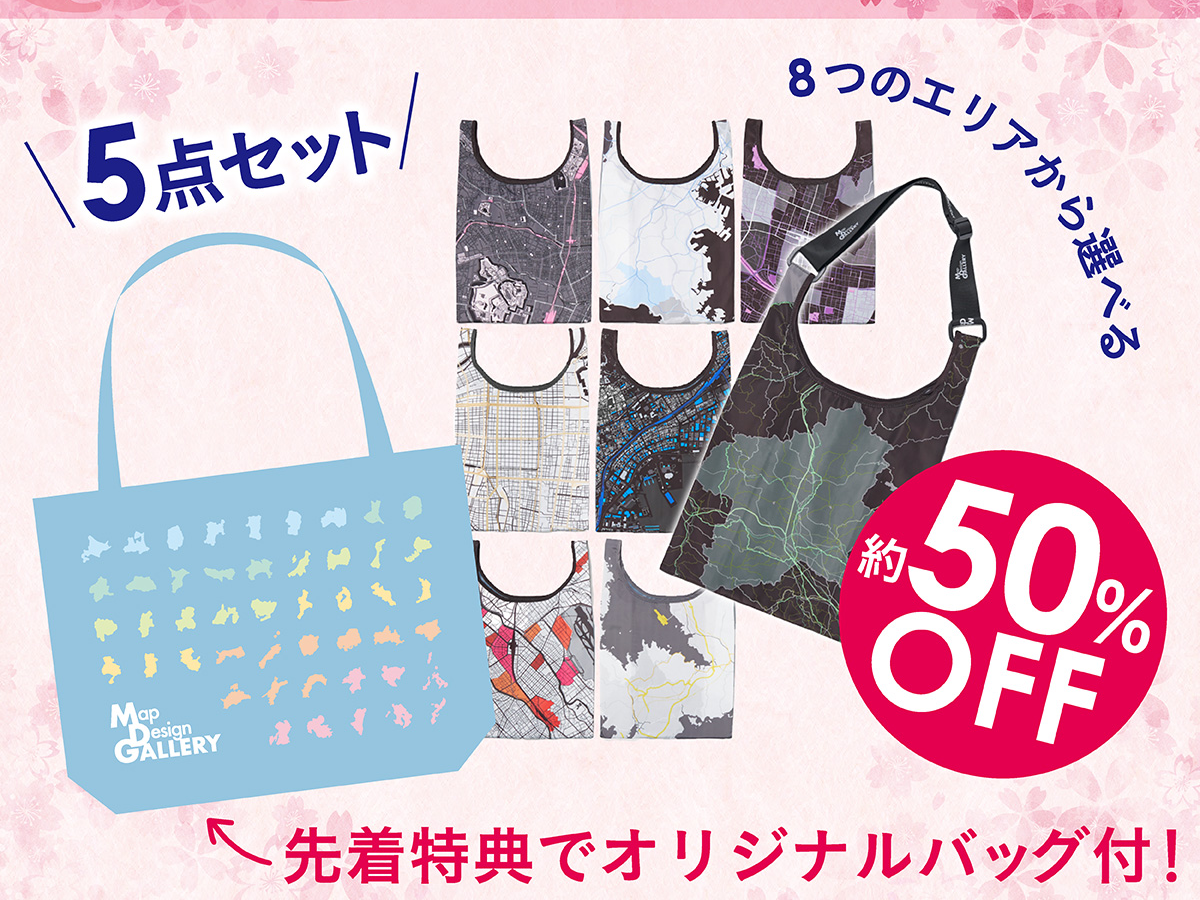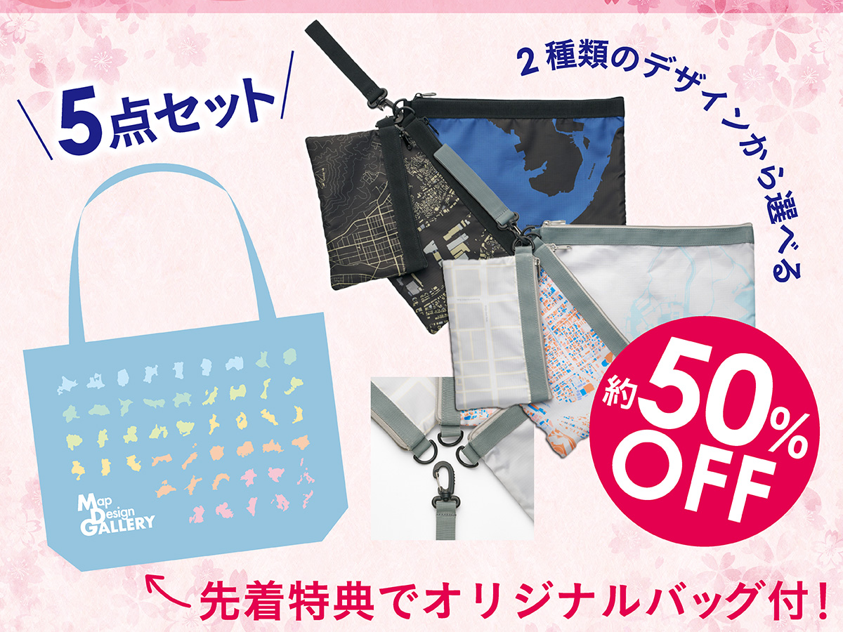 目玉アイテム「2WAYバッグ(ショルダーストラップ付)」のほか、地図柄グッズ4点が入ったセットです。8種のデザインからお選びいただけます。