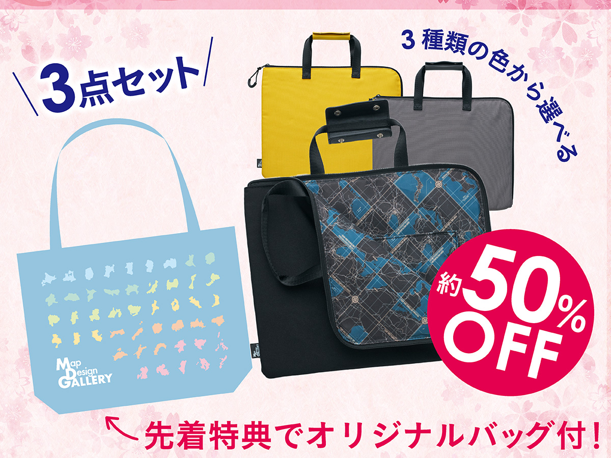 目玉アイテム「A4バッグインバッグ」のほか、地図柄グッズ2点が入ったセットです。3種のデザインからお選びいただけます。