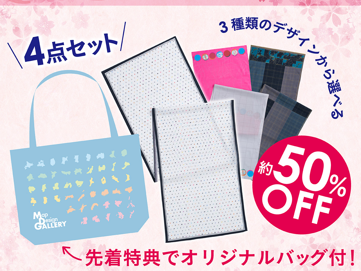 目玉アイテム「ストール」のほか、地図柄グッズ3点が入ったセットです。3種のデザインからお選びいただけます。