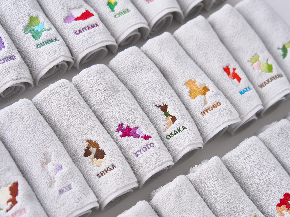 今治産の良質なライトグレーのタオル生地に、47都道府県のそれぞれの形をワンポイントで刺繍しました。刺繍部分は、都道府県の形を地域に分け、各エリアにゆかりのあるモチーフをイメージした色合いで表現しています。