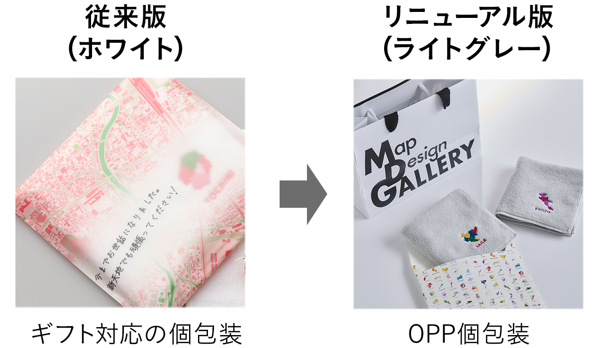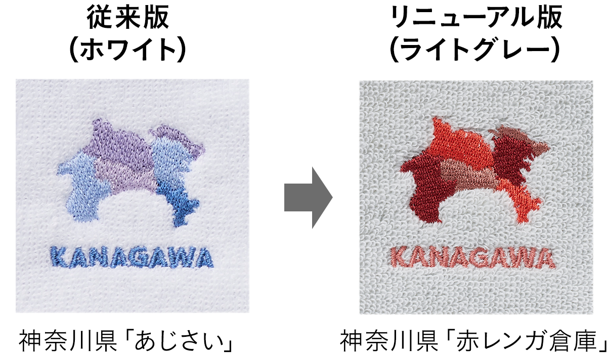 タオル本体の色を真っ白→ライトグレーに変更し、よりカジュアルに、より長く使える色味になりました。またワンポイント刺繍の色も変更しています。