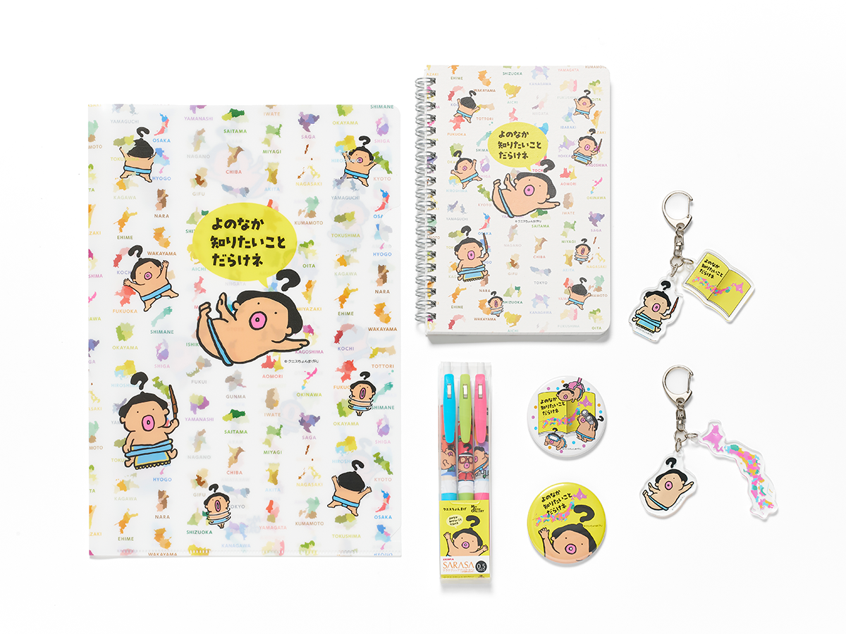 ラインナップは、缶バッジ、B6リングノート、A4クリアファイル、2連アクリルキーホルダー、ボールペン3本セット(2026年4月下旬入荷予定)です。
