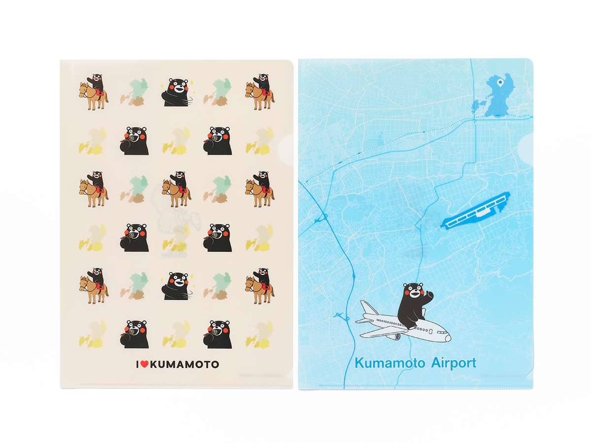 ブルー系:表面の全面に熊本空港周辺の地図を、中央下部には飛行機に乗ったくまモンをデザインしています。