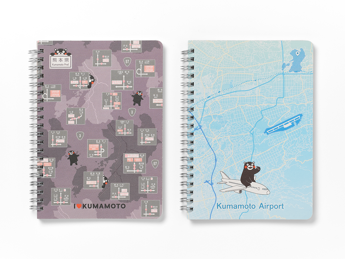 熊本空港(スカイブルー):表紙の全面には熊本空港周辺の地図を、中央下部には飛行機に乗ったくまモンをデザイン。本文は6mm罫線で、ページ内にも熊本空港周辺の地図を薄く敷き、くまモンや県図を掲載しています。
