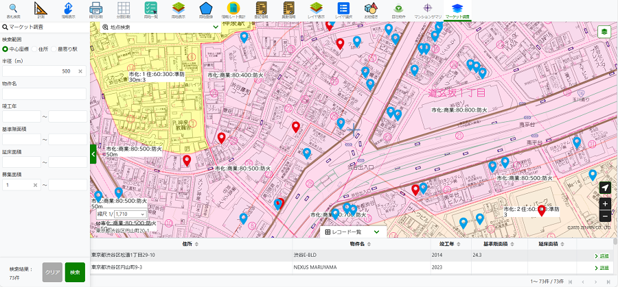 画面イメージ(用途地域+オフィス賃貸マーケットデータ+分譲マンションデータを重畳表示)
