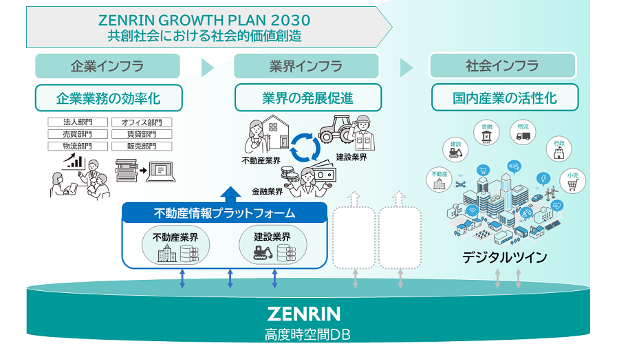 ゼンリンは、地理空間情報サービス企業として、高精度な空間情報を収集・整備した高度時空間データベースをあらゆる用途に最適化して提供する技術で、社会に貢献し続けることを企業活動の基本としています。中長期経営計画ZENRIN GROWTH PLAN 2030では「共創社会における社会的価値創造」をテーマに掲げ、データを活用して地域や自治体、各産業界の抱える社会・企業課題の解決を支援するDXソリューションの開発に取り組んでいます。