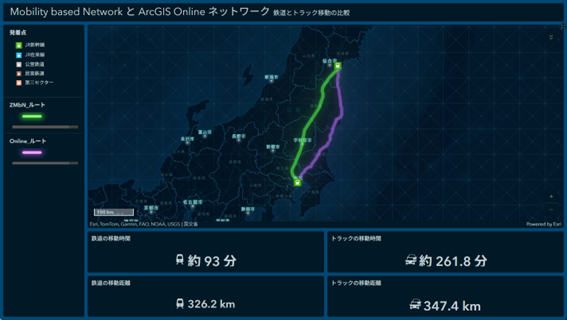 Mobility based Networkのネットワークデータセットを使って鉄道ルートを解析し、ArcGIS Online のトラックルート解析と比較したもの。