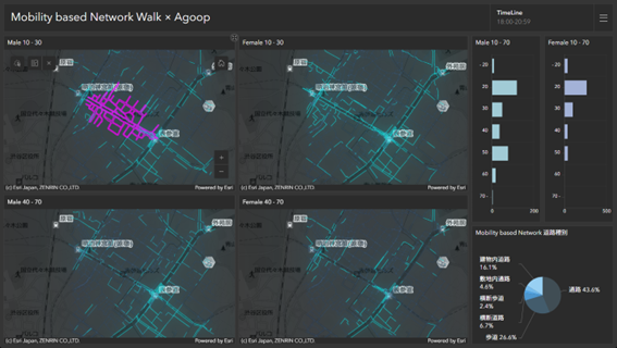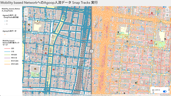 ArcGISのビッグデータ解析機能を使用し、Agoop社の流動人口データをMobility based Network:歩行者ネットワークにマップマッチングした結果
