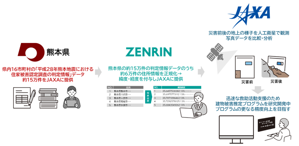 株式会社ゼンリン(本社:福岡県北九州市、代表取締役社長:竹川道郎、以下ゼンリン)は、熊本県(知事:木村敬)および国立研究開発法人宇宙航空研究開発機構(所在地:茨城県つくば市、理事長:山川宏、以下JAXA)と、「人工衛星を活用した建物被害推定プログラムに関する協力覚書」を2026年2月19日(木)に締結しました。