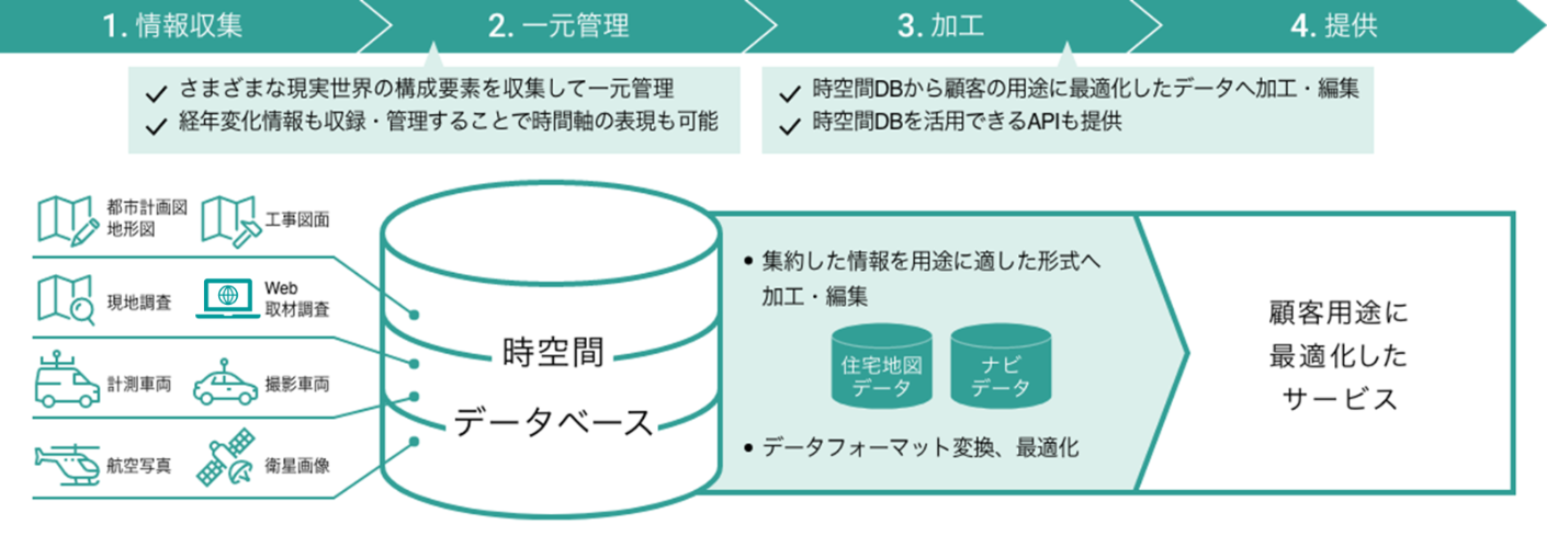 ゼンリンのさまざまなソリューションの基盤となるのは独自の「時空間データベース」です。ゼンリンは、現実世界に存在するさまざまな建物やテナントに独自のIDを付与し、詳細な位置情報を把握しています。さらに、時間軸も含めてデータを管理しています。これにより経年変化を捉え、過去・現在・未来を通じた高度なデータ活用が可能になります。