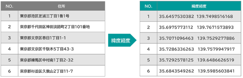 保有する住所データに対し、緯度・経度を付与し、正確な位置情報の特定をします。