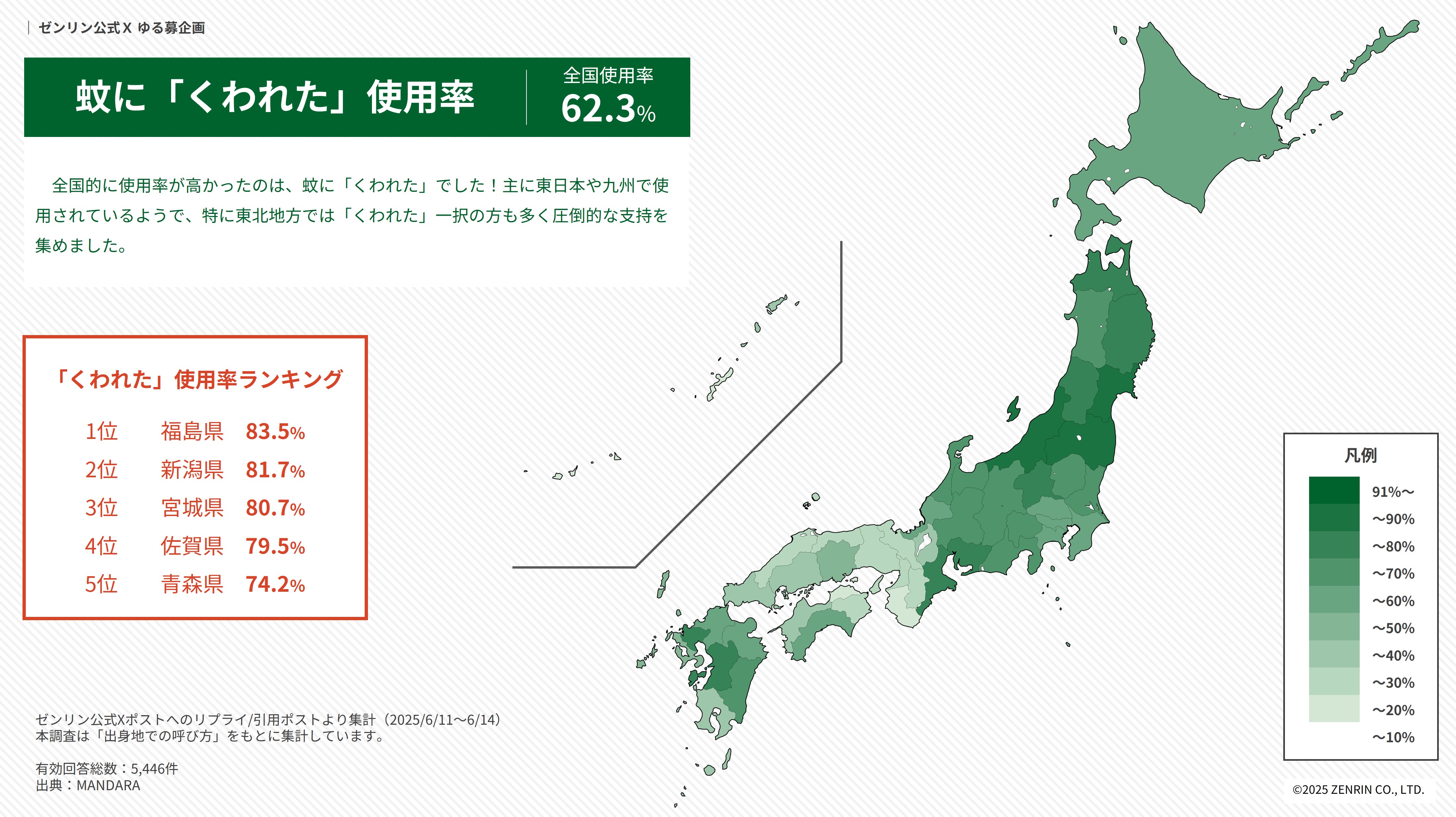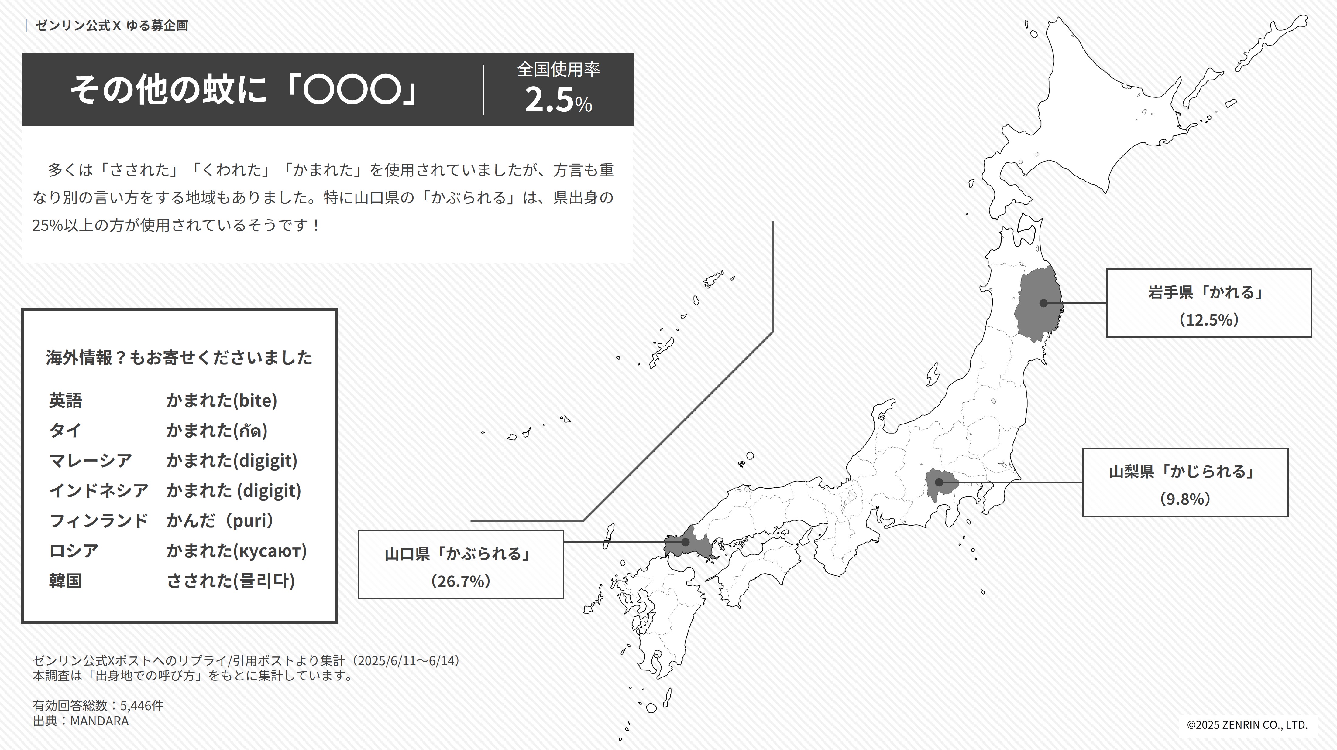 また回答で興味深かったのは沖縄県。もれなく「かまれた」高使用率なのですが、蚊のことを沖縄の言葉(うちなーぐち)で「ガジャン」と言うそうです。初めて知りました…