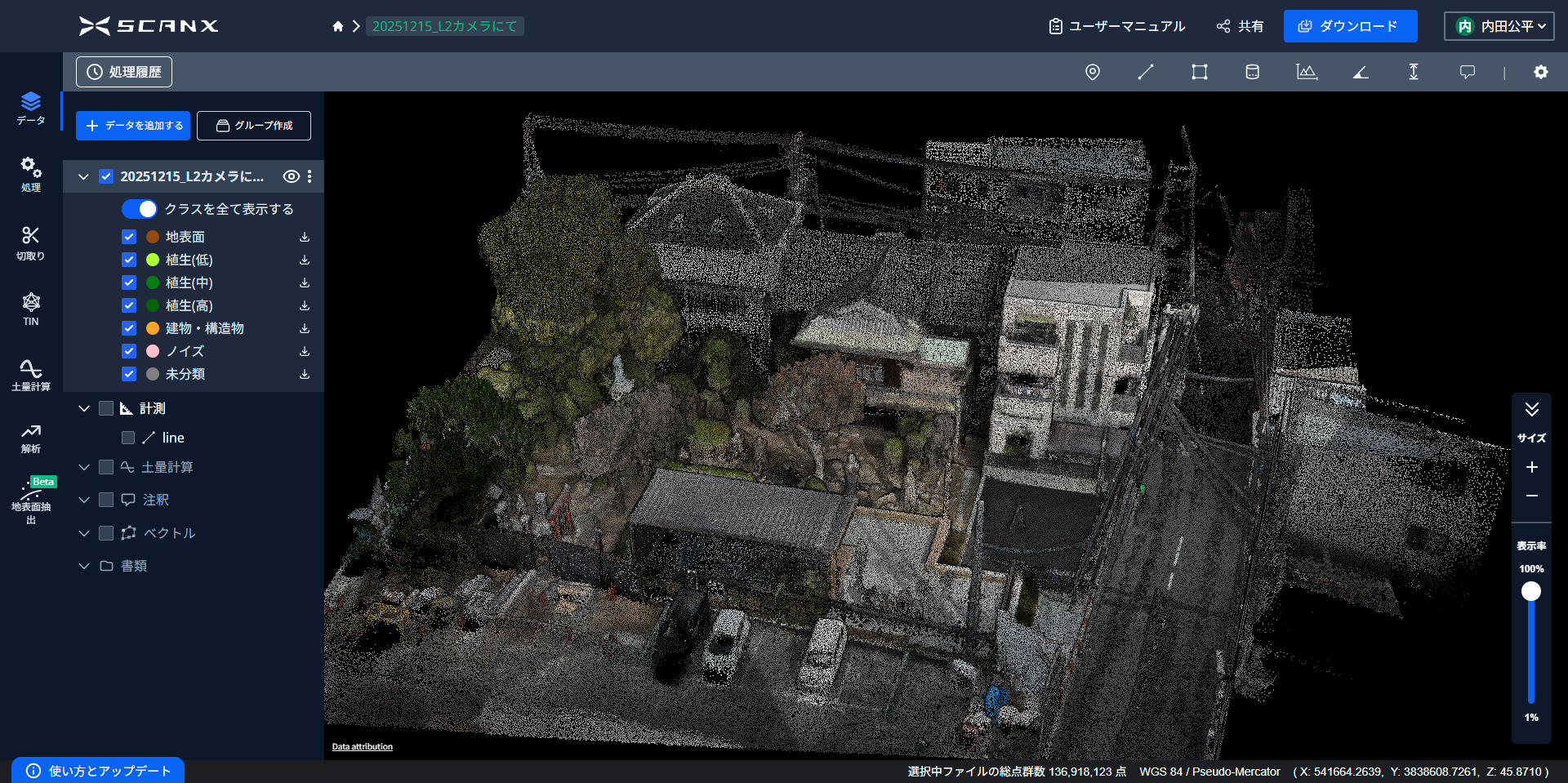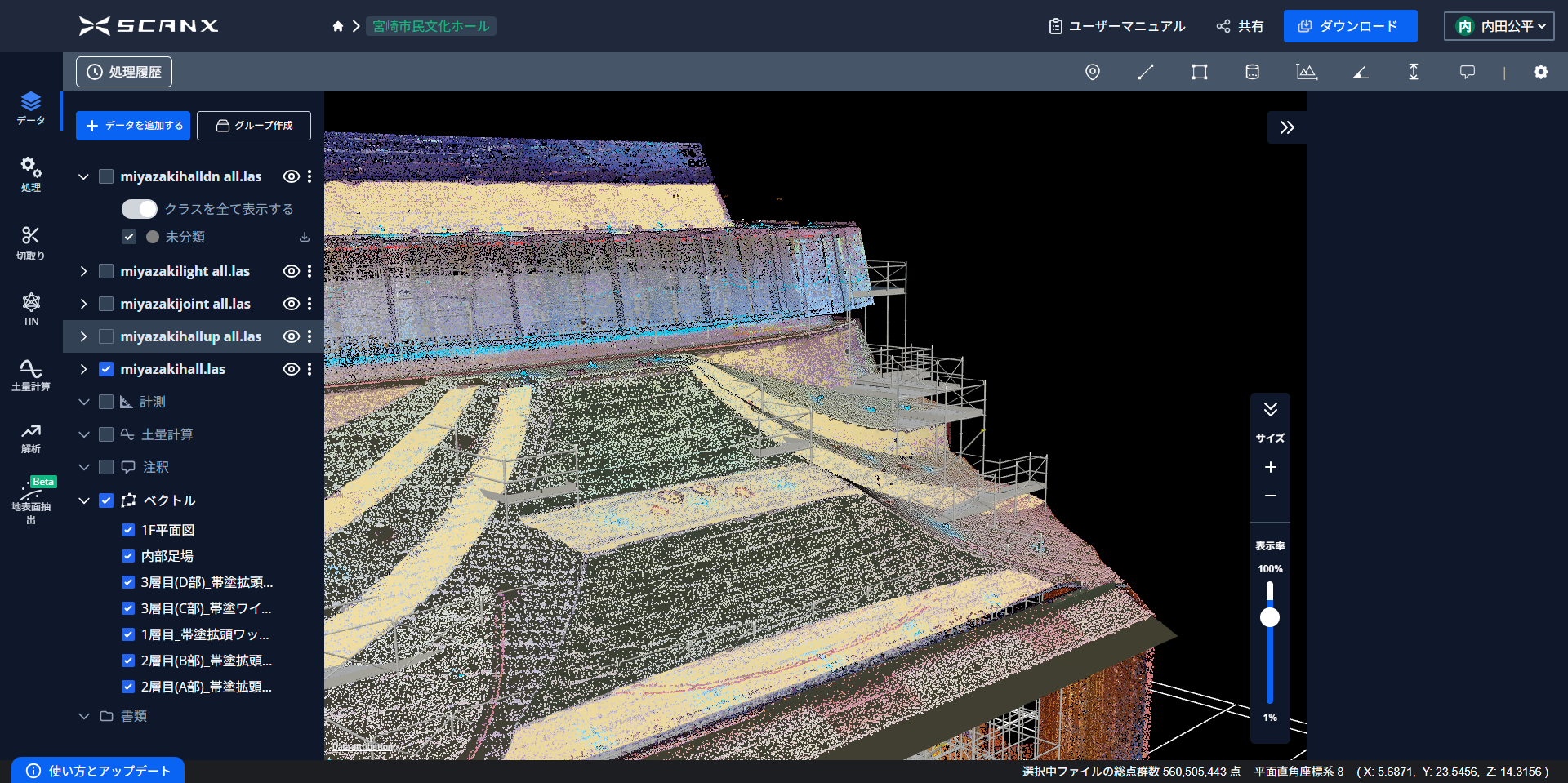 取得した点群データを実際にScanXへアップロードした画面。