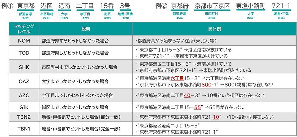 ゼンリンのどの住所階層までヒットしたか、マッチングレベルを返却することで、ユーザー住所の精度チェックにご利用いただけます。