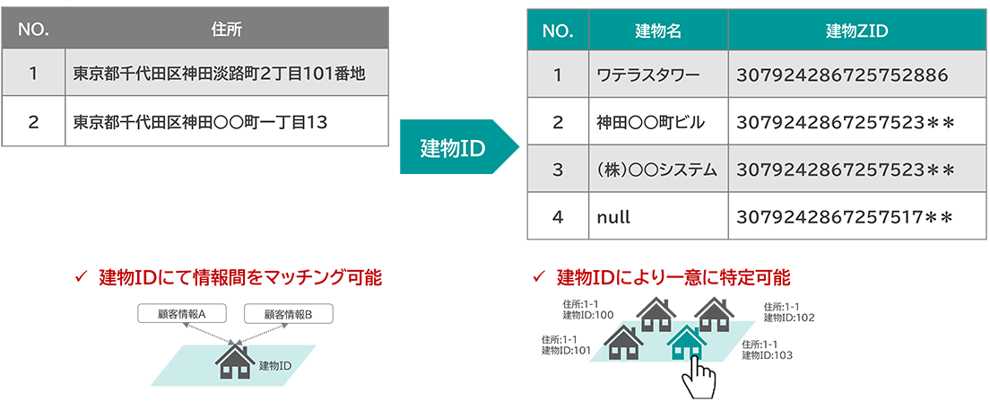 住所の建物ごとにゼンリン独自の建物ID(ZID)を付与し、建物情報の統一的な管理にご利用いただけます。