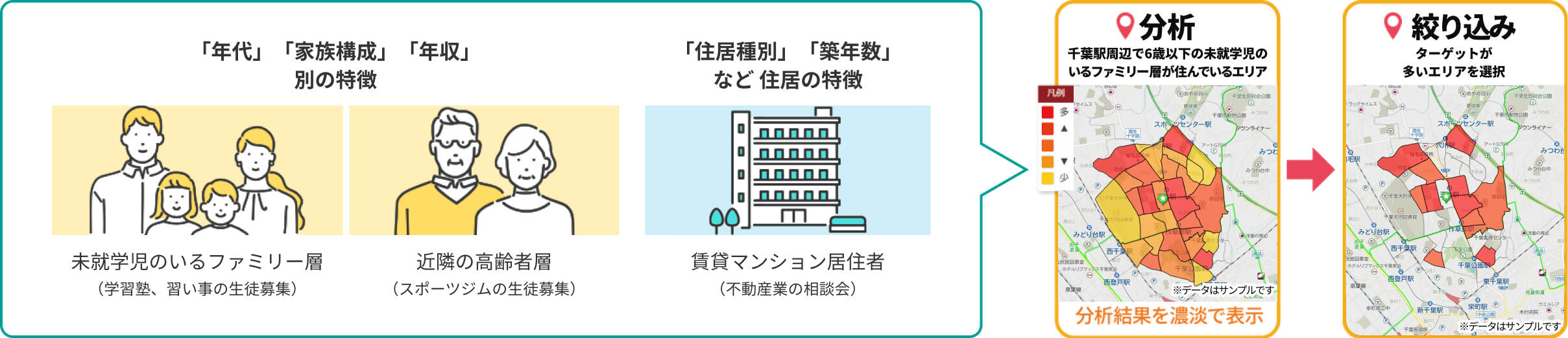 地域担当者がゼンリン独自の地図データと各種統計データをもとにした分析を共有するため、高確度でターゲットにアプローチできるエリアを選定できます。